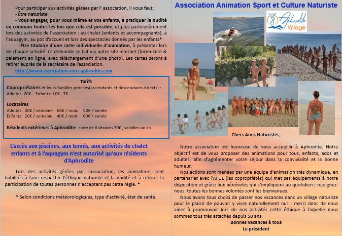 Nous avons tous choisi de passer nos vacances dans un village naturiste pour le plaisir de pouvoir y vivre naturellement nus : merci donc de nous aider à promouvoir lors de nos activités cette éthique à laquelle nous sommes tous très attachés depuis plus de 40 ans.